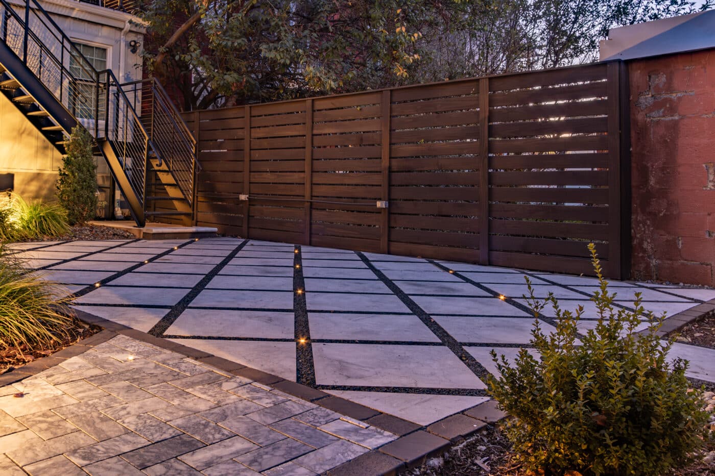 When Chris, the founder of E-Impact Marketing, first came to us for a backyard renovation, he had several ideas to make the space more usable. One of the considerations was to create a permeable driveway for better parking for staff and clients. Design work didn’t begin in earnest until quite a while later, when a construction project to add some much-needed office space was well underway. This new office space included a second-story rooftop deck that overlooked the backyard. The goals for the backyard had shifted a bit for E-Impact. Parking was no longer of great importance. Rather, the goal was to create a relaxing space for their team to relax on breaks… or even just appreciate a beautiful day and take their work outside! The office was a historic residence, with exposed brick and some great architectural details. Rather than creating a period-correct patio with clay brick or bluestone, the choice was made to have a more contemporary and urban modern flair.