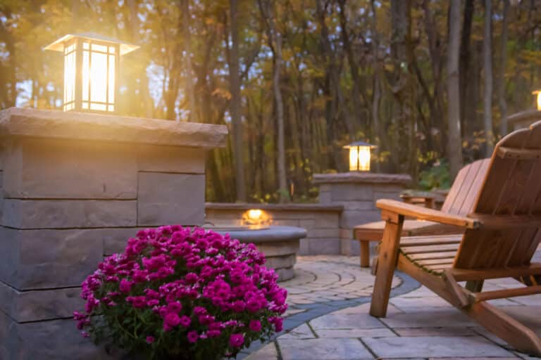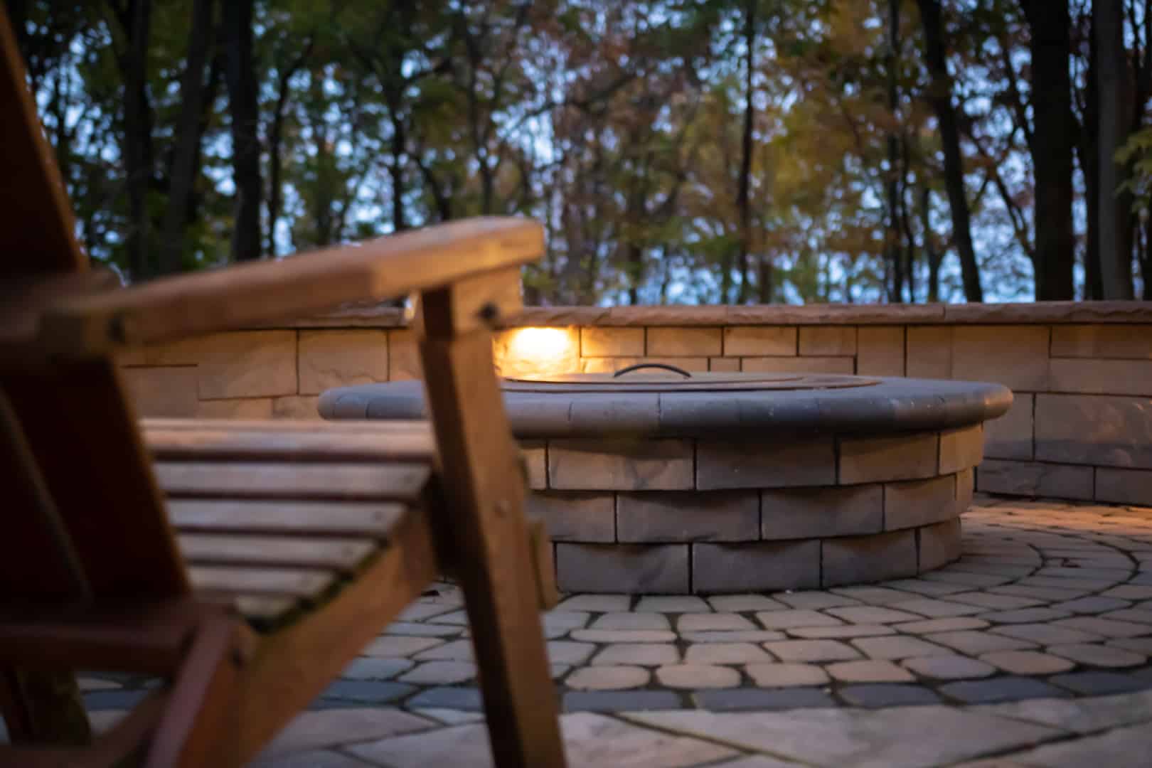 The retaining wall and paving materials were chosen to complement the rustic wooded setting. Like so many of these patio projects, the scope of work expanded to include rebuilding the front walkway and installing custom radius step treads. LED landscape lighting was added in addition to lighting built into the walls & pillars.