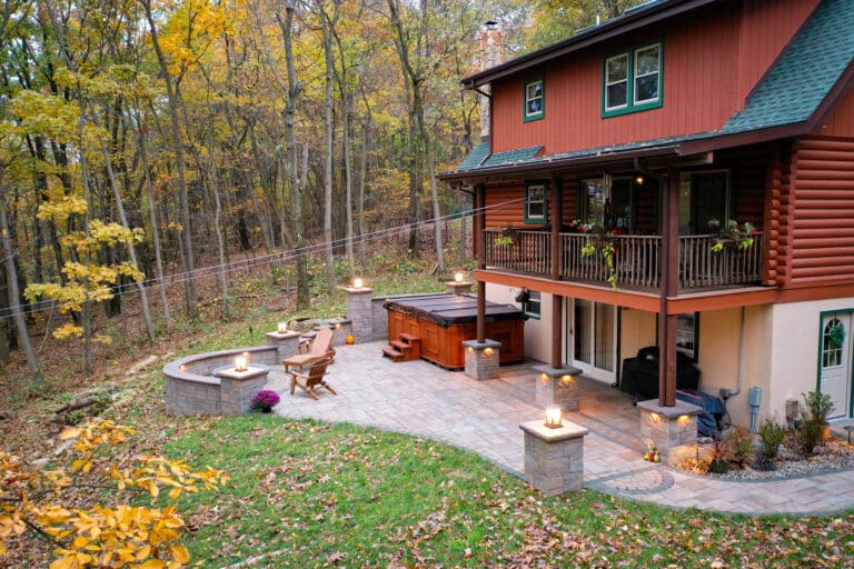 From the beginning, the project had some challenges with existing grades. A pool, swim spa, and hot tubs were all options discussed during the East Bethel patio design process. While it took a year to work through the many options for their outdoor living area, by fall 2018 we were ready to break ground! Plans were made for an above-ground swim spa that would have to be craned over their log cabin home.
